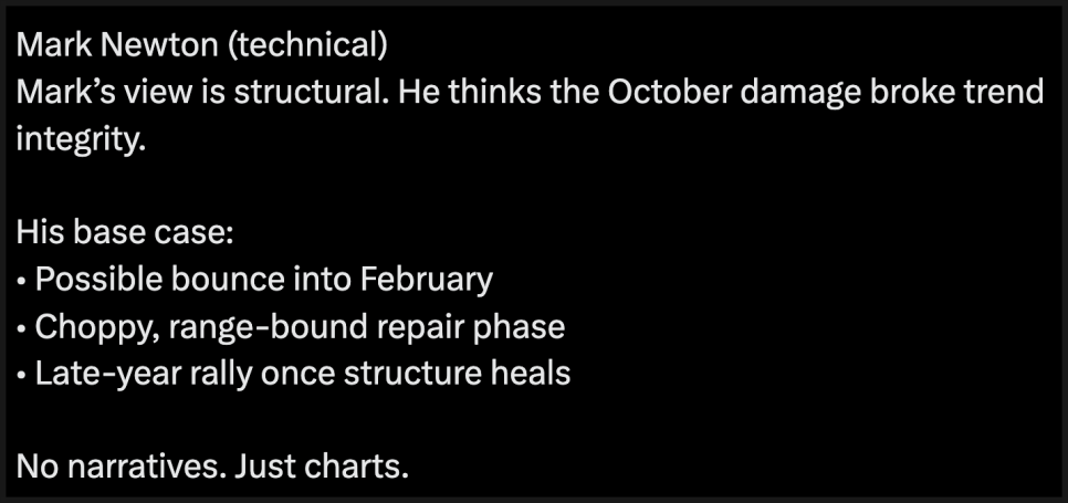 사실 펀드스트렛에는 마크 뉴턴이라는 애널리스트가 있는데 이 사람의 관점은 또 다릅니다. 지난 10월의 가격 움직임이 추세를 훼손했다고 보고, 2월까지 반등 가능성은 열어두되 이후에는 박스권에서의 회복 과정이 필요하다고 봅니다. 구조가 회복되면 연말 랠리가 가능하다는 시나리오죠.