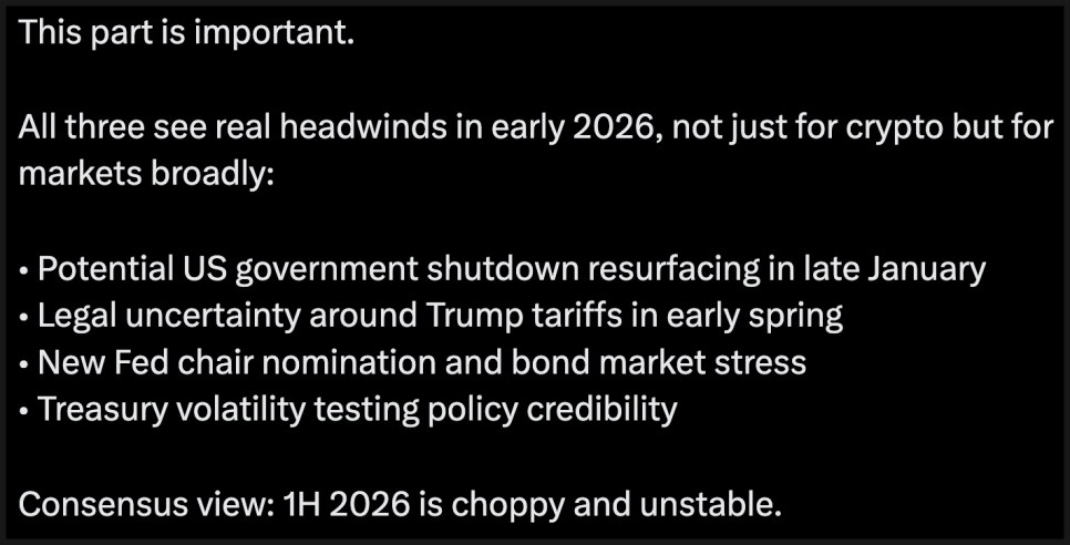 중요한 건, 이 두 사람이 전혀 다른 얘기를 하고 있는 게 아니라는 점입니다. 캐시안에 따르면 이들은 모두 2026년 상반기를 불안정한 구간으로 보고 있습니다. 암호화폐뿐 아니라 시장 전반에 부담 요인이 겹쳐 있다는 데는 공감대가 있다는 거죠. 1월 말 재부각될 수 있는 미국 정부 셧다운 문제, 봄철 트럼프 관세 관련 법적 불확실성, 연준 의장 교체 과정에서의 채권 시장 스트레스, 국채 변동성 등은 공통적으로 인식하는 리스크입니다. 결론적으로 2026년 상반기는 거칠고 불안정하다는 게 합의된 시각이라는 겁니다.
