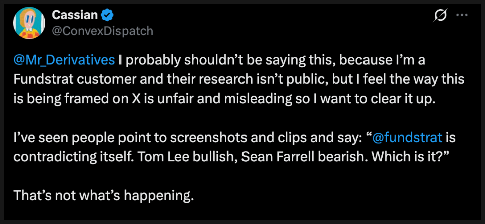 캐시안은 먼저, 이런 얘기를 공개적으로 하는 게 조심스럽다고 밝힙니다. 펀드스트랫 리서치는 원래 비공개인데, X에서 돌아가는 프레임이 너무 불공정하고 오해를 낳고 있어서 바로잡고 싶었다는 겁니다. 사람들이 스크린샷 몇 장을 들고 와서 “펀드스트랫은 자기모순이다, 톰 리는 강세고 션 패럴은 약세다, 도대체 뭐가 맞는 거냐”라고 말하는데, 그건 상황을 완전히 잘못 짚은 해석이라는 거죠.