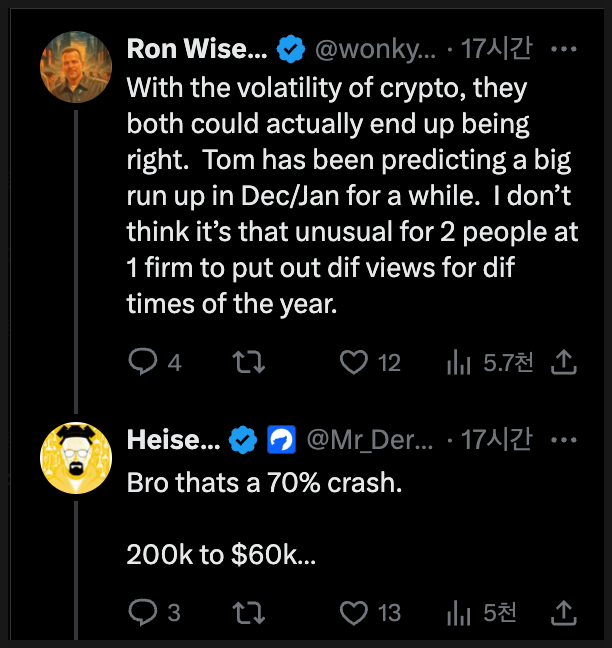 이에 대해 반대 의견도 댓글로 나왔는데요. 암호화폐처럼 변동성이 큰 자산에서는 서로 다른 시점의 전망이 모두 맞을 수도 있고, 한 회사 안에서 연중 서로 다른 타이밍을 전제로 한 시각이 나오는 게 그렇게 이상한 일은 아니라는 겁니다. 하지만 하이젠버그는 “그게 말이 되냐, 20만 달러에서 6만 달러면 70% 폭락이다”라며 다시 받아칩니다.