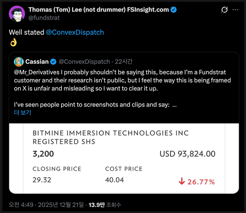이 설명에 대해 톰 리는 X에서 “잘 정리된 설명이다”라는 짧은 답글을 남겼습니다. 공식 성명을 낸 것은 아니지만, 시장에서는 이 반응을 캐시안의 해석에 동의한다는 신호로 받아들이는 분위기입니다. 즉, 서로 다른 전망이 충돌하는 게 아니라, 서로 다른 목적과 기간을 다루고 있다는 점을 인정한 셈이죠.
