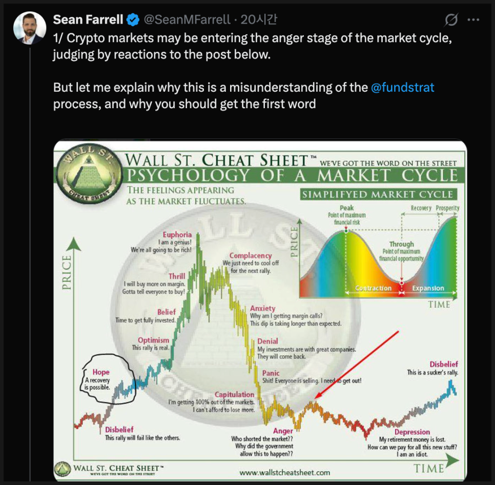 그런데 그 직후 이 모든 논란의 중심에 선 애널리스트 본인이 등판해서 해명에 나섰습니다. 먼저 션 패럴은 지금의 반응 자체가 시장 사이클상 ‘분노 단계’에 가까워 보인다고 말합니다. 가격보다 감정이 앞서고, 일부 정보만 떼어내 해석하면서 오해가 커지고 있다는 인식이 깔려 있죠. 그는 이 논쟁이 펀드스트랫의 리서치 프로세스를 잘못 이해한 데서 출발했다고 전제합니다.
