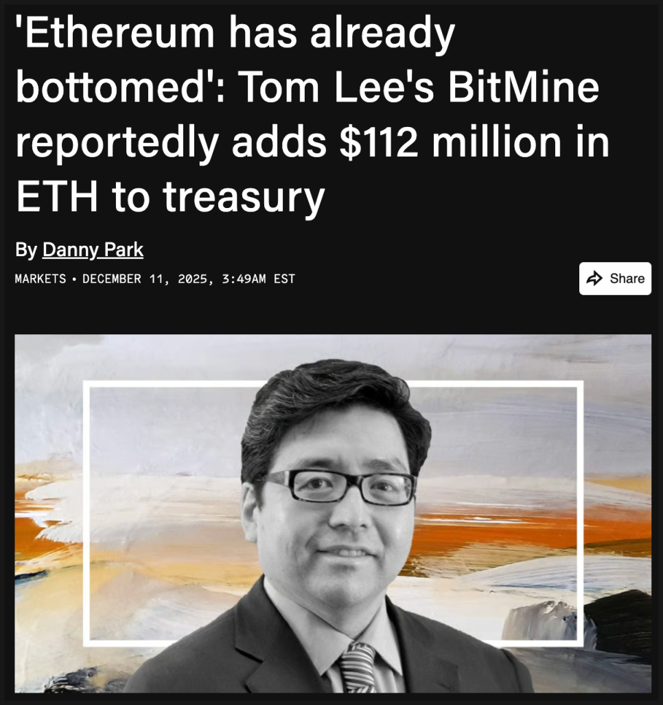 게다가 톰 리가 펀드스트렛이 아닌 비트마인 이머션 차원에서는 '내부적으로 이더리움 가격이 저점을 찍었다고 판단했다'고 선언하며 이더리움 대거 추가 매집에 나선 만큼 투자자들의 이목이 집중되고 있습니다. 톰 리를 치켜세우든 디스를 하든 내년 초까지는 기다려도 좋을 것 같습니다.