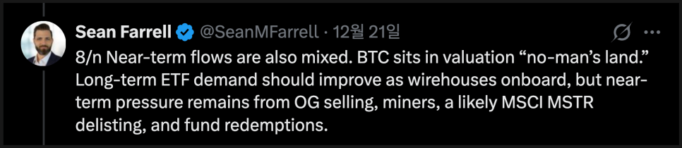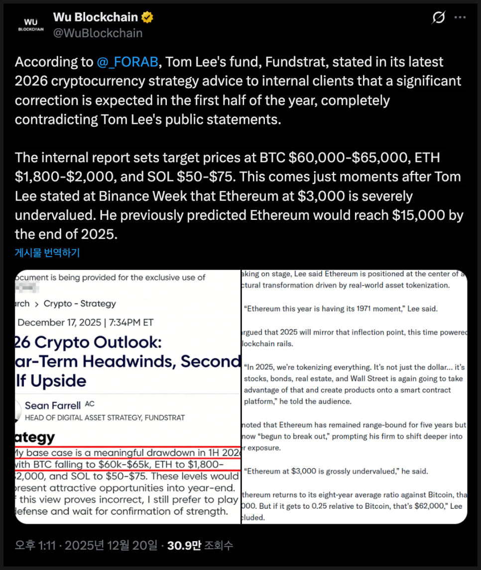여기에 팔로워가 50만이 넘는 우 블록체인이라는 크립토 계정도 가세했습니다. 12월 17일자로 배포된 해당 내부 리포트를 직접 확인했고, 월 249달러짜리 유료 자료라고까지 덧붙였습니다. 이 말이 사실이라면, “공개 발언”과 “내부 고객용 전략” 사이에 명확한 괴리가 존재한다는 인상을 줄 수밖에 없다는 거죠.