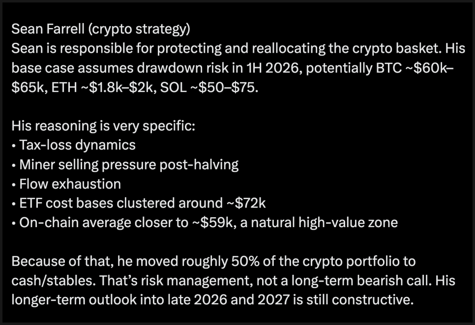 션 패럴의 관점은 포트폴리오를 실제로 관리하고 재배분하는 책임자의 관점이기 때문에 2026년 상반기에 조정 위험이 있다고 보고, 비트코인 6만~6만5천 달러, 이더리움 1,800~2,000달러, 솔라나 50~75달러 같은 수치를 기본 시나리오로 뒀다고 합니다. 그 이유도 구체적인데, 세금 이슈로 인한 매도, 반감기 이후 채굴업자 매도 압력, 수급 피로, ETF 매입 단가가 7만2천 달러 부근에 몰려 있다는 점, 온체인 평균 가격이 5만9천 달러 근처라는 점 등을 근거로 듭니다. 그래서 그는 암호화폐 포트폴리오의 약 절반을 현금이나 스테이블코인으로 옮겼는데, 이게 리스크 관리라는 설명입니다. 2026년 하반기와 2027년에 대해서는 여전히 긍정적 시각을 유지하고 있다는 거죠.