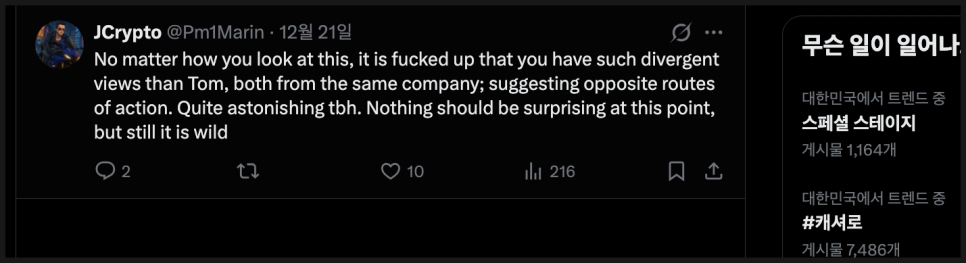 하이젠버그라는 유저가 특히 문제 삼는 지점은 여기입니다. “이게 신규 투자자나 소액 개인 투자자 입장에서 보기에 얼마나 혼란스럽겠느냐”는 겁니다. 그의 말대로라면, 회사의 대표이자 대중적으로 가장 많이 노출되는 인물이 톰 리인데, 내부에서 너무 자주 상반된 전망이 튀어나오면 결국 메시지가 흐려진다는 거죠.