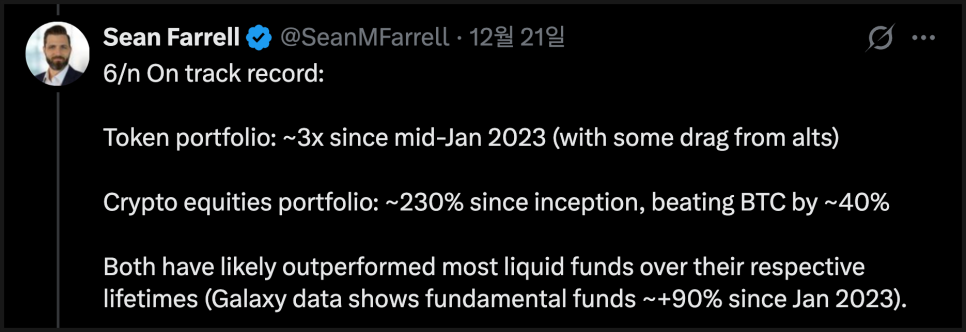 성과에 대해서도 직접 언급했습니다. 토큰 포트폴리오는 2023년 1월 중순 이후 약 3배 상승했고, 암호화폐 주식 포트폴리오는 설정 이후 약 230% 상승해 비트코인 수익률을 40% 정도로 크게 웃돌았다고 설명합니다. 자신이 단기 흐름을 조심스럽게 보는 이유가 단순한 감정이 아니라, 실제 운용 경험에서 나온 판단이라는 점을 강조하는 대목입니다.