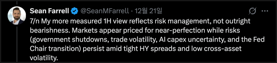 그의 2026년 상반기 관점이 조심스러운 이유도 구체적으로 나옵니다. 현재 시장이 지나치게 완벽한 시나리오를 가격에 반영하고 있는 반면, 정부 셧다운 가능성, 무역 변수, AI 투자 불확실성, 연준 의장 교체 같은 리스크는 여전히 남아 있다는 겁니다. 여기에 신용 스프레드가 낮고 자산 간 변동성도 억눌린 상태라, 작은 충격에도 흔들릴 수 있다고 보는 거죠.