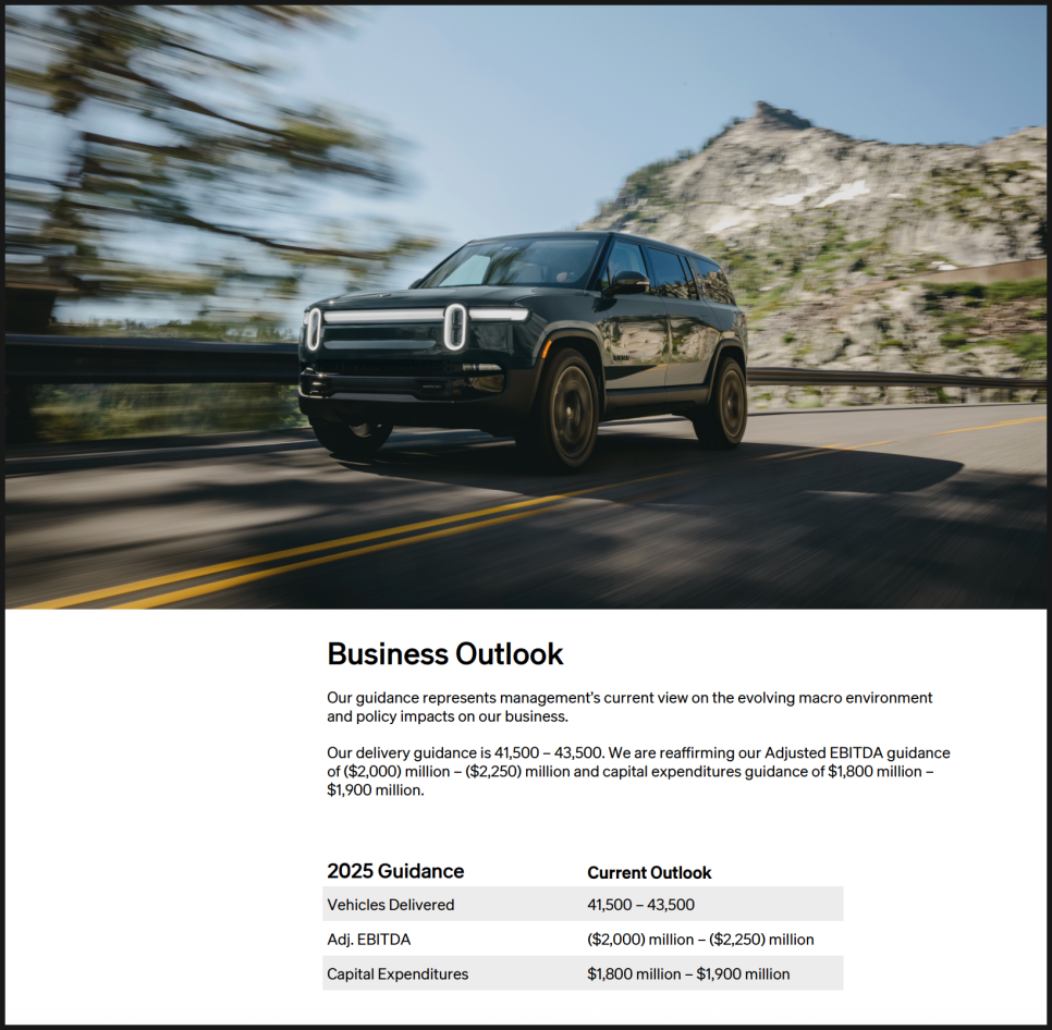 물론 현실적인 부담도 여전히 큽니다. 리비안은 2025년 연간 인도량을 약 4만 1,500대에서 4만 3,500대로 제시했는데, 조정 EBITDA는 여전히 큰 폭의 적자를 예상하고 있습니다. 설비 투자와 연구개발을 포함한 자본 지출 역시 상당한 수준입니다. 즉, 리비안은 여전히 ‘투자 단계’에 있는 기업이며, R2 출시 전까지는 재무적 긴장 상태가 이어질 수밖에 없습니다.