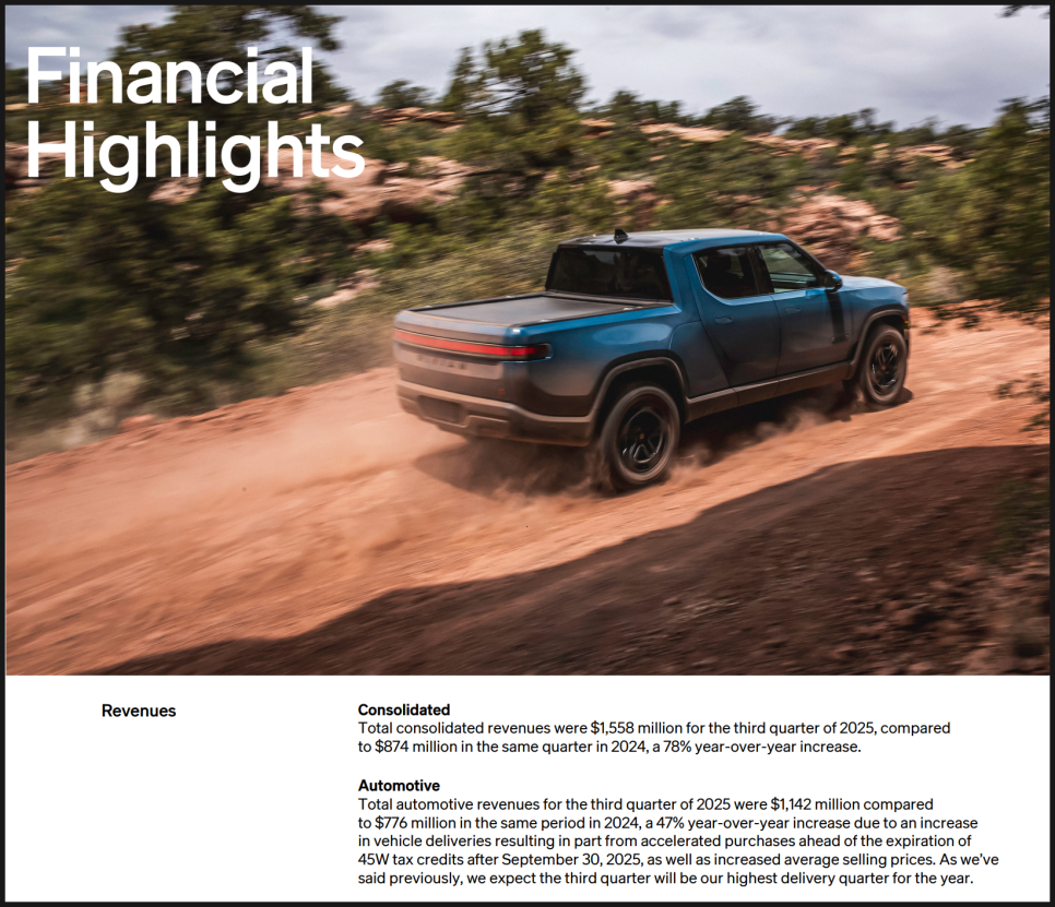 그렇다면 이제 리비안에 대한 이런 기대가 실적으로도 어느 정도 뒷받침되고 있는지 살펴볼 필요가 있습니다. 리비안은 지난 2025년 11월 4일에 발표된 3분기 실적을 발표했습니다. 해당 분기에서 리비안은 매출 15억 5,800만 달러를 기록하며 전년 대비 78% 성장했습니다. 무엇보다 주목할 부분은 분기 기준으로 2,400만 달러의 매출총이익을 기록했다는 점입니다. 아직 순이익이나 현금흐름 기준으로는 적자이지만, 비용 구조 개선이 실제 숫자로 나타나기 시작했다는 점에서 상징적인 의미가 큽니다.