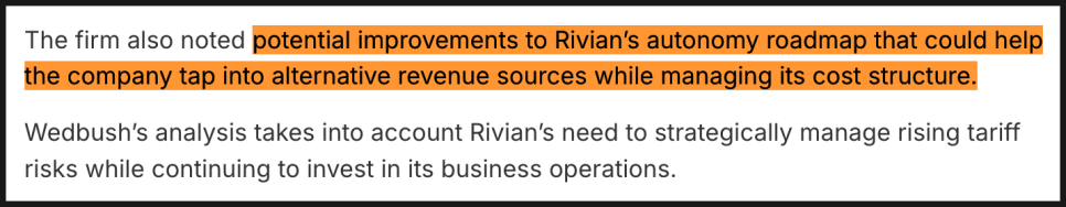 웨드부시 외에도 리비안의 AI 데이 직후 투자 의견과 목표가를 상향한 애널리스트들이 꽤 있었는데요. 배어드(Baird)는 리비안에 대한 투자의견을 기존 ‘중립(Neutral)’에서 ‘아웃퍼폼(Outperform)’으로 상향하며 목표주가를 25달러로 제시했는데, R2 플랫폼과 더불어 리비안의 자율주행 기술, 특히 자체 칩 개발과 같은 수직 통합 전략을 긍정적으로 평가했습니다.