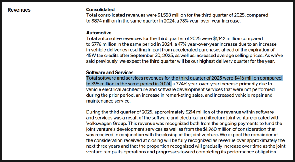 매출 구성도 중요합니다. 이 분기에서 소프트웨어 및 서비스 매출은 약 4억 1,600만 달러에 달했는데, 폭스바겐(Volkswagen)과의 전장 아키텍처 및 소프트웨어 협력과 관련된 수익이 크게 반영된 결과로 알려져 있습니다. 여기에 리마케팅과 차량 수리 및 유지보수 사업에서도 의미 있는 성장과 이익 기여가 있었다고 설명했습니다. 차량 판매 외에도 소프트웨어 역량 자체로 의미 있는 매출을 창출할 수 있다는 가능성을 이미 보여주고 있기 때문에 유의미한 부분이라고 볼 수 있겠습니다.