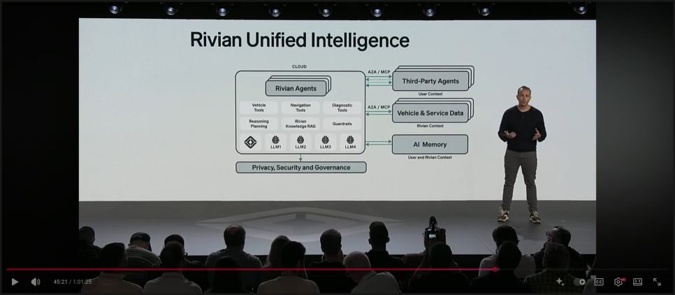 리비안의 AI 전략은 차량 주행에만 국한되지 않습니다. 회사는 리비안 통합 인텔리전스(Rivian Unified Intelligence, RUI)라는 새로운 AI 아키텍처를 통해 서비스, 정비, 앱까지 전반적인 고객 경험을 바꾸겠다는 구상을 제시했습니다.