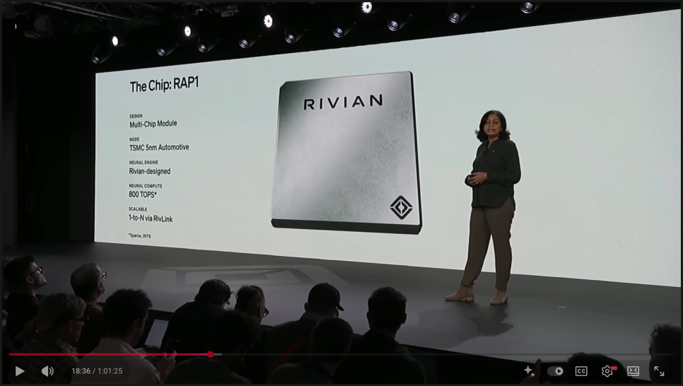 기술적으로 가장 눈에 띄는 부분은 리비안이 자체 반도체 시대로 본격 진입했다는 점입니다. 리비안은 자율주행을 위한 전용 칩인 리비안 오토노미 프로세서 1(Rivian Autonomy Processor 1, RAP1)을 공개했습니다. 해당 칩은 5나노 공정 기반의 커스텀 프로세서로, 연산과 메모리를 하나의 멀티칩 모듈에 통합한 구조를 갖고 있는데요. 이를 통해 효율성과 성능을 동시에 끌어올리고, 자동차 안전 무결성 수준도 충족하도록 설계됐다는 설명입니다.
