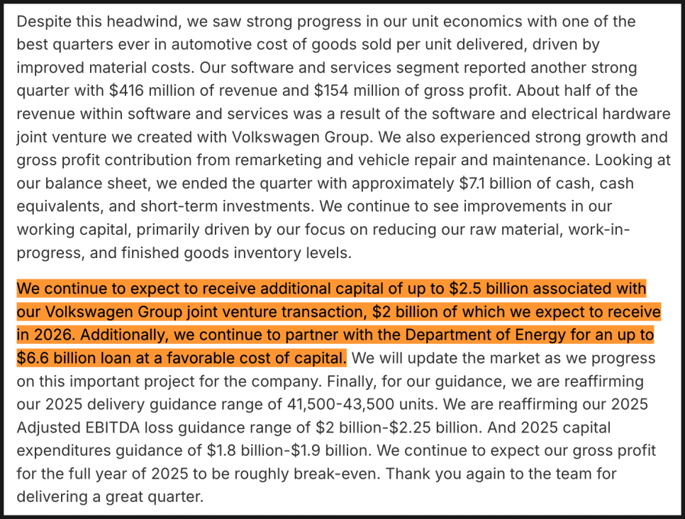 재무 상태 측면에서는 분기 말 기준 약 71억 달러의 현금, 현금성 자산, 단기 투자 자산을 보유하고 있다고 밝혔습니다. 재고 관리에 집중하면서 운전자본도 개선되고 있다는 설명이 뒤따랐습니다. 또한 폭스바겐 그룹과의 합작 거래와 관련해 최대 25억 달러의 추가 자금을 받을 예정이며, 이 중 20억 달러는 2026년에 유입될 것으로 예상하고 있습니다. 더불어 미국 에너지부(Department of Energy)와의 협력을 통해 최대 66억 달러 규모의 저금리 대출을 추진 중이라는 점도 재확인했습니다.