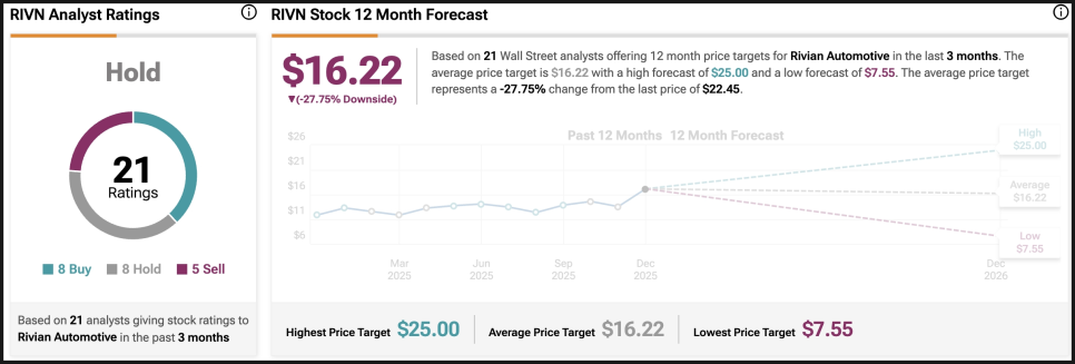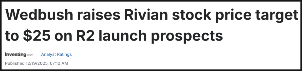 리비안의 AI 데이 직후 애널리스트들은 RIVN 주식에 대한 투자 의견과 목표가를 조정했습니다. 예를 들어 웨드부시(Wedbush)는 리비안 오토모티브(Rivian Automotive, RIVN)에 대한 목표주가를 기존 16달러에서 25달러로 대폭 상향 조정하며 투자의견 ‘아웃퍼폼(Outperform)’을 유지했습니다. 이번 목표주가는 현재 리비안에 대해 제시된 애널리스트 목표가 중 최고 수준에 해당하며, 주가가 52주 고점인 20.33달러 부근에서 거래되고 있는 상황을 감안하면 상당히 공격적인 상향입니다.