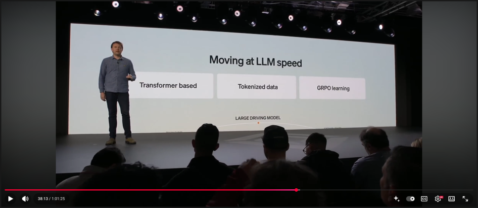 한편 하드웨어만큼이나 중요한 축은 소프트웨어입니다. 리비안은 자율주행을 소프트웨어 중심 문제로 정의하며, 리비안 오토노미 플랫폼(Rivian Autonomy Platform)을 소개했습니다. 이 플랫폼은 차량에서 수집된 데이터를 다시 학습에 활용하는 엔드 투 엔드 데이터 루프를 기반으로 하고 있습니다. 특히 리비안은 대형 언어 모델(LLM) 학습 방식에서 영감을 받은 대형 주행 모델(Large Driving Model, LDM)을 공개했습니다. 이 모델은 방대한 주행 데이터에서 더 나은 운전 전략을 추출해 차량에 적용하는 방식으로, 그룹 상대 정책 최적화(Group-Relative Policy Optimization, GRPO)라는 기법을 활용한다고 설명했습니다.
