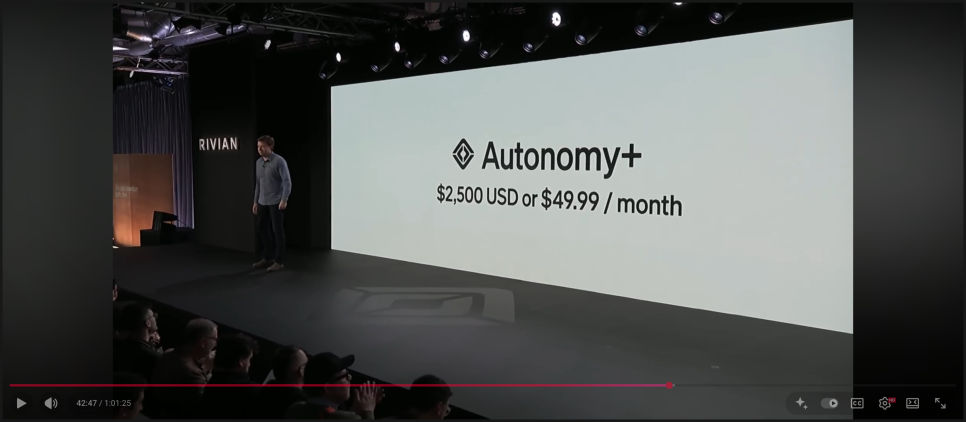 한편 이번 발표애서 또 한 가지 중요한 포인트는 자율주행의 수익화입니다. 리비안은 자율주행 구독 서비스인 오토노미 플러스(Autonomy+)를 공식 발표했습니다. 해당 서비스는 2026년 초 출시를 목표로 하고 있으며, 일회성 2,500달러 결제 또는 월 49.99달러 구독 방식으로 제공될 예정입니다. 리비안은 이 서비스가 도로 안전성을 높이는 동시에 고객 수요를 충족시키고, 장기적으로는 회사의 중요한 수익 동력이 될 수 있다고 설명했습니다.