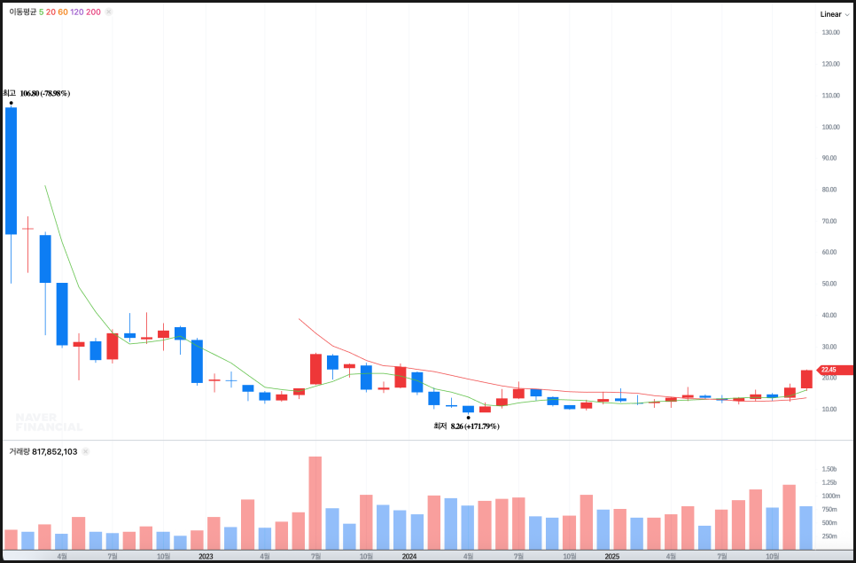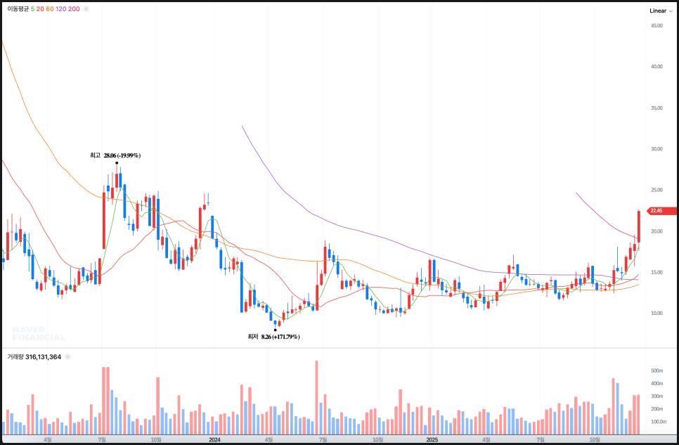 주봉으로 보면 직전 박스 상단이었던 15~16달러를 확실히 넘어선 상태입니다. 이 가격대는 그동안 주가가 수차례 막혔던 구간이었고, 이때 주가는 120주선인 보라색선 아래에서 계속 눌리던 구조였습니다. 그런데 최근 주봉 상승으로 주가는 1200주선을 명확히 상회했고, 동시에 5주선과 20주선이 15달러대에서 위로 정배열되기 시작했습니다. 특히 200주선인 핑크색선이 20달러대 부근에 위치해 있었는데, 이 선을 종가 기준으로 넘겼다는 점은 주봉에서 추세 전환으로 해석될 수 있는 중요한 신호입니다. 현재 주봉에서 다음 목표로 삼을 가격은 25달러 안팎이며, 이 구간은 과거 주봉 기준 강한 매물대가 남아 있는 영역입니다.
