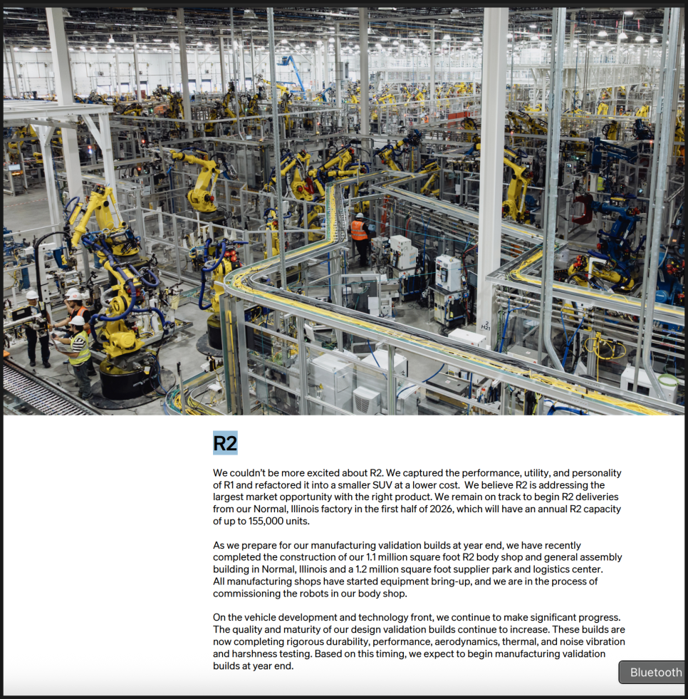 웨드부시는 2026년을 리비안에게 있어 ‘의미 있는 해’로 지목했습니다. 핵심 근거는 2026년 상반기로 예정된 R2 차량 출시입니다. 웨드부시는 R2가 본격적으로 시장에 출시되면 리비안의 인도량 지표가 눈에 띄게 개선될 수 있을 것으로 보고 있으며, 이 점이 회사의 체질 개선과 밸류에이션 재평가의 출발점이 될 수 있다고 판단했습니다.