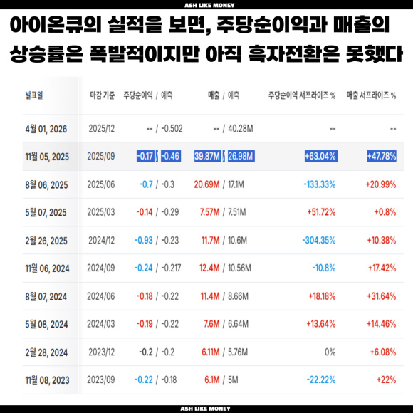 현재 큐비트는 100개 이상이고 더 많은 큐비트가 구현되려면 특수 환경에 처해야 한다. 큐비트를 백만개 이상을 확보해야 컨트롤이 가능하며 범용으로 상용화가 가능하다. 아이온큐의 실적을 살펴보면, 25년 3분기 매출이 3,990만 달러로 전년 동기 대비 매출은 222% 상승하였다. 하지만 아직 영업이익을 내지는 못하고 있다. 순손실이 주당 24센트이고 향후 영업이익을 내려면 28년 이후라고 예측하고 있다.