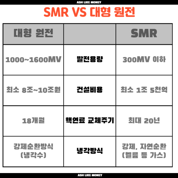 SMR은 탄소 배출도 거의 없으며 대형 원전 대비 뛰어난 안전성과 경제성을 갖추고 있다. 대형 원전보다 낮은 출력을 가지고 있어 외부 전원 없이 자연적인 물리 현상을 이용하는 계통을 사용하기에 훨씬 안전하다. 발전용량으로는 300MW 이하, 중요한 냉각방식도 자연순환 및 강제순환 방식으로 안전한 가스를 활용한다. 실제로 구글이 카이로스 파워와 손을 잡고 소형 원자로를 확보하였고 아마존도 SMR 스타트업 회사와 협업을 하기 시작했다.