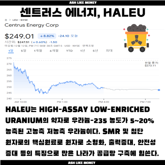 미국 내 HALEU 생산 허가를 받은 유일한 기업으로 독접기업으로 성장세를 보이고 있다. 하지만, AI 전력 데이터센터 관련 회사이기에 AI 대장주식들이 하락함에 따라 동반 하락하는 모습을 보였다. 최고점 464달러에서 현재 249달러까지 기록했다.
