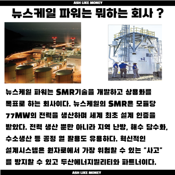 SMR 관련 주식으로는 "센트러스 에너지", "오클로", "뉴스케일 파워" 등이 대표적이고 한국엔 "두산에너지빌리티"가 있다.