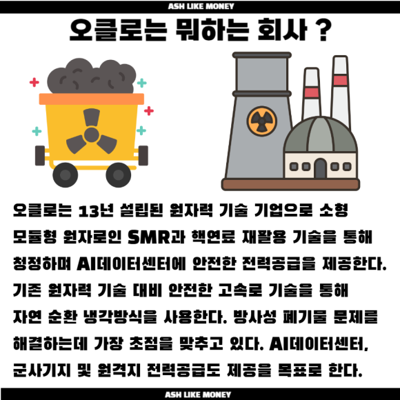 오클로는 SMR 기술혁신을 목표로 하는 스타트업 기업으로 OPENAI의 CEO 샘 올트만을 포함한 여러 투자자들로부터 투자를 받고 있다. 투자를 받고 있는 만큼 화제성이 있는 회사이지만, 아직 영업이익은 나오지 않고 있다. 오클로는 AURORA SMR 모델을 제작 중인데, 특징으로는 폐연료를 재활용하는 독특한 설계로 환경 친화적인 솔루션을 제공한다. 액체 금속 소듐 냉각방식을 통해 대형 격납구조가 필요 없고 최대 75MWE 전력을 생산할 수 있다. 오클로는 미국 에너지부인 DOE로부터 핵연료 시설 설계 승인을 획득하여 핵연료 재활용할 수 있는 허가를 받았다.