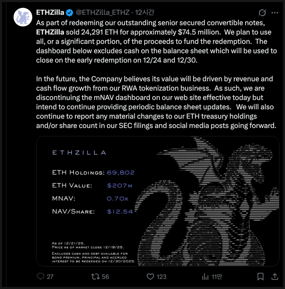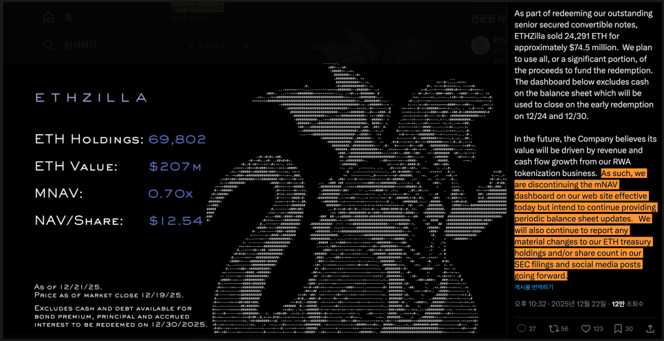 또 하나 눈에 띄는 변화는 투자자 커뮤니케이션 방식입니다. 이더질라는 DAT 투자자들이 주로 참고해 오던 mNAV 대시보드를 즉시 중단한다고 밝혔습니다. mNAV는 시가총액이 순자산, 즉 보유한 암호화폐 가치 대비 어느 수준인지 보여주는 지표인데요. 회사는 대신 정기적인 재무상태표 업데이트만 제공하겠다고 했습니다. 암호화폐 트레저리 기업보다는 일반 사업회사로 재평가받겠다는 의도가 읽히는 대목입니다.