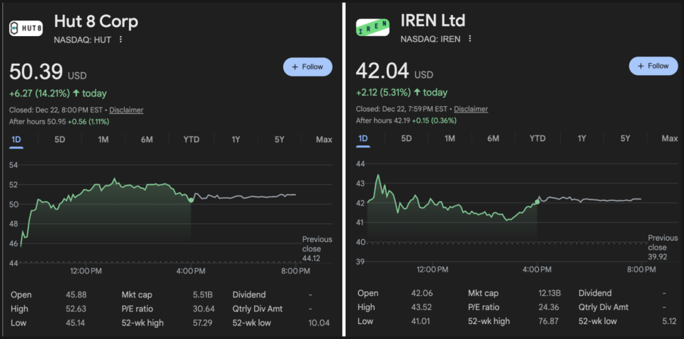 우선 큰 그림부터 보면, 미국 장중 거래에서 암호화폐 전반은 소폭 약세를 보였습니다. 반대로 금과 은 같은 귀금속, 그리고 주식 시장은 뚜렷하게 상승했죠. 이른바 ‘AI 트레이드’는 여전히 유효한데, 특히 사업 모델을 AI 인프라 쪽으로 전환한 비트코인 채굴 기업들이 이날 시장에서 두드러진 상승을 보였습니다. 다만 스트래티지(MSTR)처럼 전통적인 의미의 암호화폐 관련주들은 지지부진한 모습을 보였습니다. 스트래티지 얘기는 조금 있다 더 해보도록 하겠습니다.