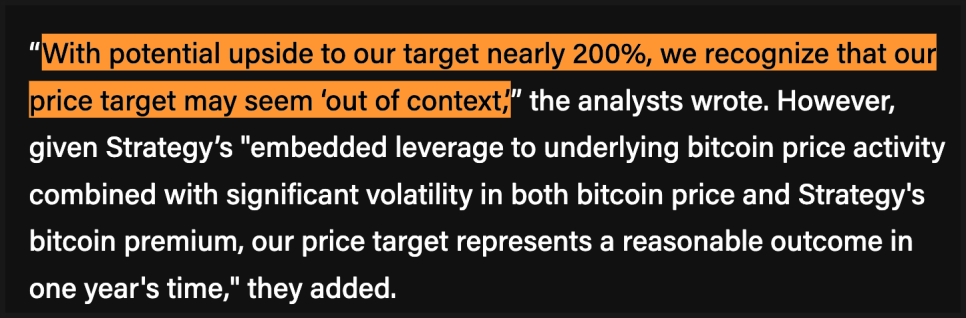이에 대해 애널리스트들은 스트래티지가 비트코인 가격 변동성에 구조적으로 레버리지가 걸린 회사라는 점을 강조했습니다. 비트코인 가격 자체의 변동성, 여기에 스트래티지 주식이 갖는 비트코인 프리미엄 변동성까지 고려하면, 1년 후 500달러라는 목표는 충분히 현실적인 시나리오라는 설명입니다.