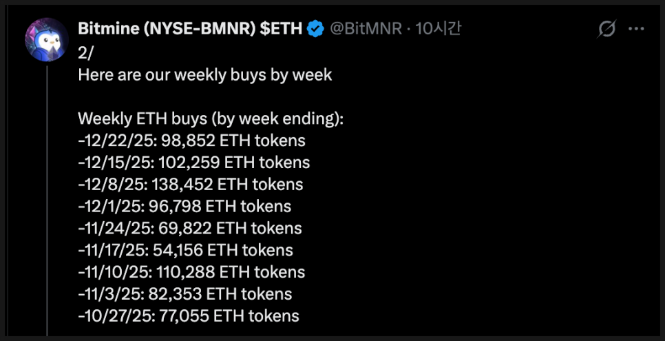 최근 몇 달간 암호화폐 가격이 고점 대비 밀리면서, 많은 디지털 자산 트레저리 기업들이 매입을 멈추거나 일부 자산을 매도하는 쪽으로 돌아섰습니다. 하지만 비트마인은 이런 흐름과 달리 비교적 일정한 속도로 이더리움을 계속 사들이고 있습니다.