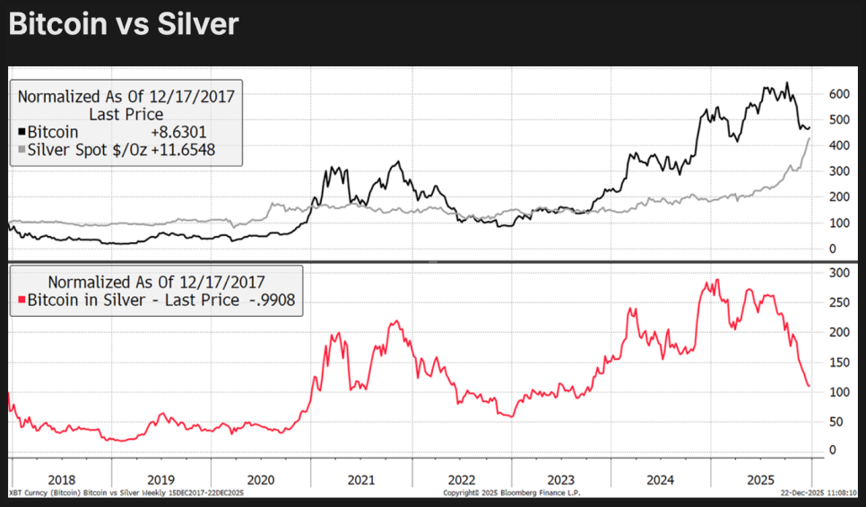 마지막으로 눈여겨볼 부분은 귀금속과 비트코인의 관계입니다. 바이트트리(ByteTree)라는 리서치회사의 애널리스트들은 최근 보고서에서 “귀금속 강세장이 잠시 멈추기 전까지는 비트코인과 암호화폐가 본격적으로 상승하기 어려울 것”이라고 평가했는데요. 다만 이들은 장기적으로 보면 비트코인이 지난 몇 년간 금과 은을 웃도는 수익률을 기록해왔다는 점도 함께 짚었습니다. 흥미로운 점은 최근 은 가격의 가파른 상승으로 인해, 지난 8년간 누적 수익률 기준에서는 은이 거의 비트코인과 비슷한 수준까지 따라붙었다는 점입니다.