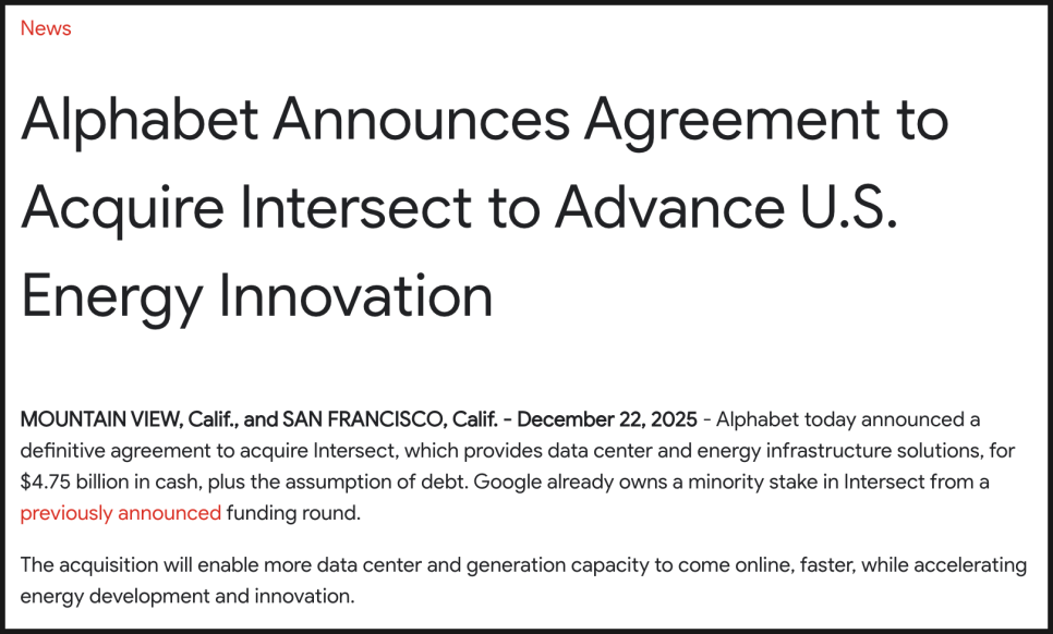 한편 AI 관련 흐름은 여전히 강합니다. 암호화폐 관련 주식들을 보면, 비트코인 채굴 기업 중에서도 AI 인프라와 고성능 컴퓨팅 쪽으로 방향을 튼 기업들이 확실히 시장을 아웃퍼폼했습니다. 이 분위기에 불을 지핀 재료는 구글의 모회사 알파벳이 AI 인프라 스타트업 인터섹트를 47억 5천만 달러에 인수한다는 소식이었죠. 알파벳은 이번 인수를 통해 데이터센터와 발전 설비를 더 빠르게 확충하고, 에너지 개발과 혁신 속도를 높일 수 있을 것이라고 설명했습니다.
