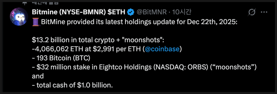 이번 매입 규모는 월요일 가격 기준으로 약 3억 달러 정도로 평가됩니다. 흥미로운 점은 이렇게 대규모 매수를 했음에도 불구하고, 비트마인의 현금 보유액은 여전히 10억 달러로 변함이 없다는 점입니다. 즉, 현금 여력을 유지한 상태에서 이더리움 비중을 계속 늘리고 있다는 의미죠. 현재 비트마인의 이더리움 트레저리 가치는 120억 달러를 웃돌며, 상장사 가운데 알려진 곳 중에서는 최대 규모의 이더리움 보유 기업입니다.