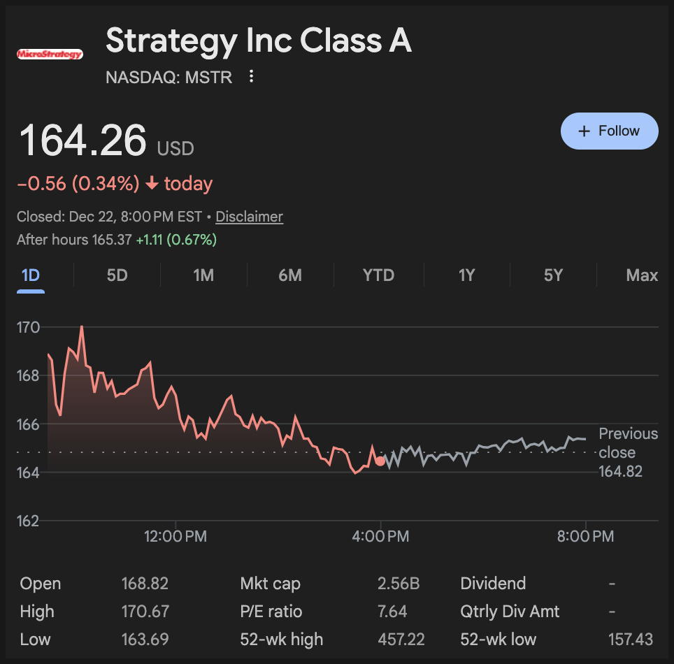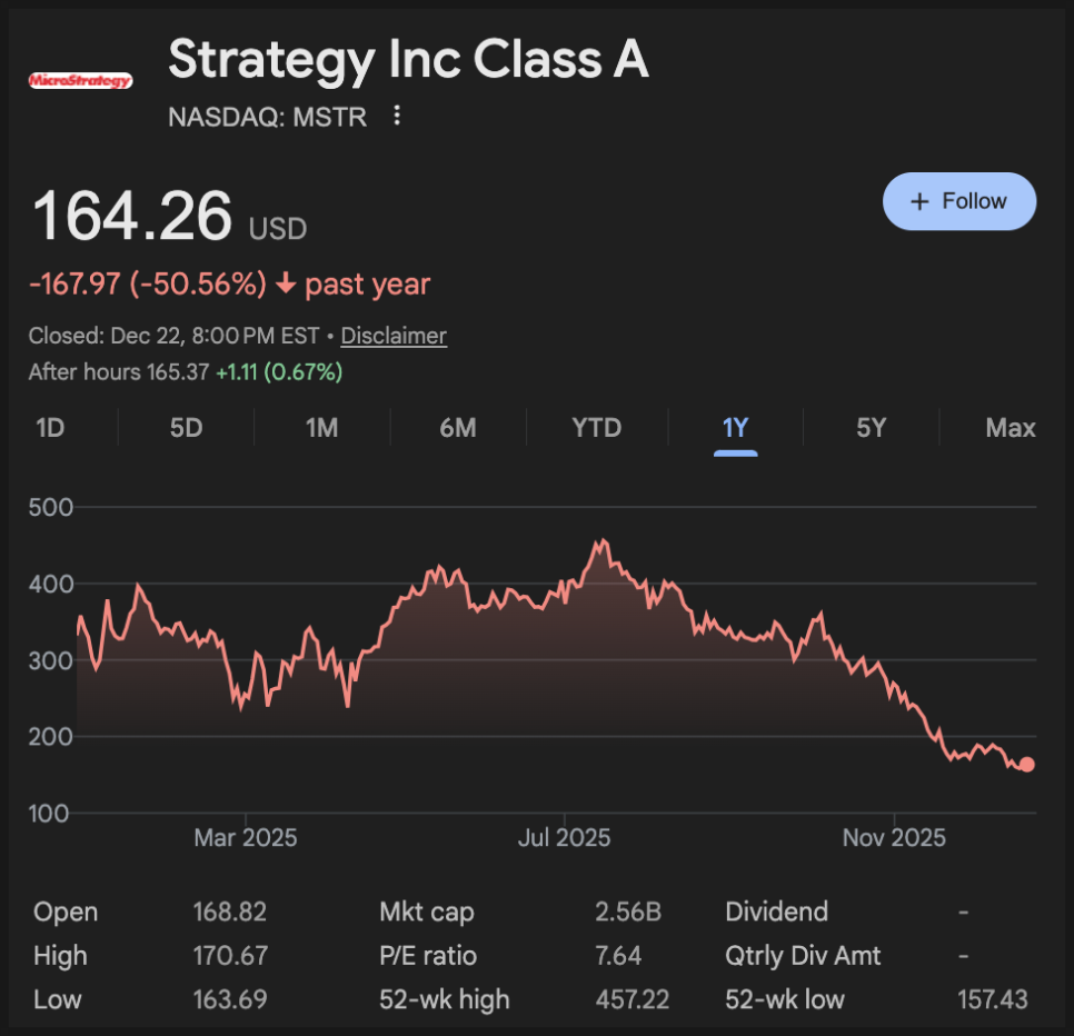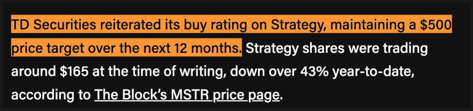 이런 평가를 바탕으로 TD 시큐리티즈는 스트래티지에 대한 매수 의견을 유지했고, 향후 12개월 목표주가도 500달러로 그대로 제시했습니다. 기사 작성 시점 기준 스트래티지 주가는 약 165달러 수준이었고, 연초 대비로는 40% 이상 하락한 상태였죠. 목표주가만 놓고 보면 거의 200% 가까운 상승 여력이 있는 셈이라 다소 과해 보일 수 있습니다.