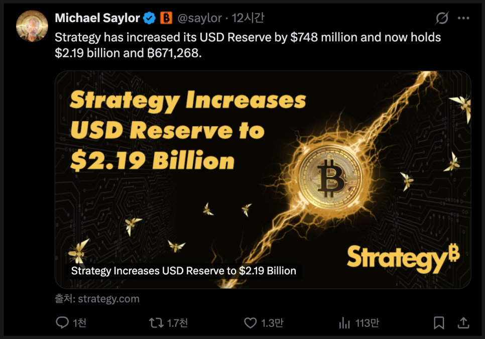 한편 마이클 세일러가 이끄는 비트코인 트레저리 기업 스트래티지는 지난주 추가적인 비트코인 매입을 잠시 멈췄습니다. 대신 현금 보유고를 크게 늘리는 선택을 했는데요. 스트래티지는 보통주 발행 등을 통해 약 7억4,800만 달러를 조달했고, 이를 전액 달러 준비금으로 쌓으면서 미국 달러 현금 보유액을 총 21억9,000만 달러까지 늘렸다는 소식을 발표했습니다.