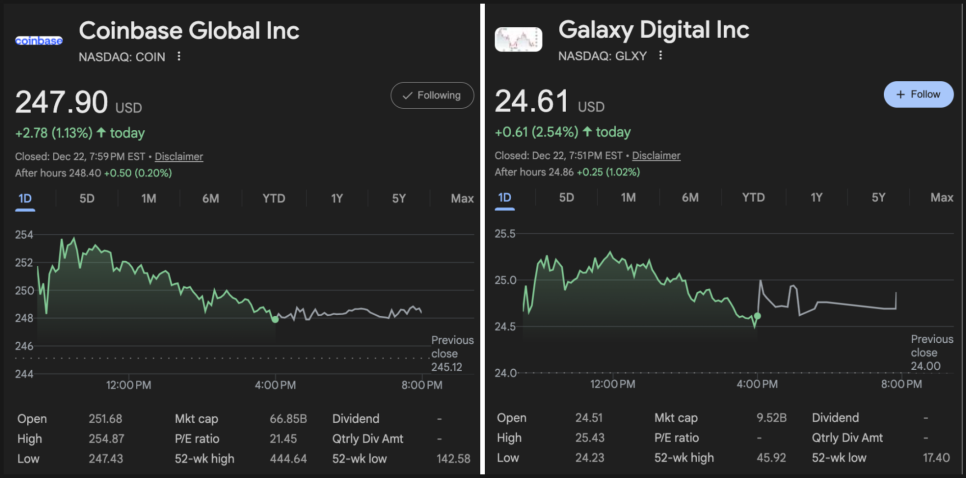 그 외에도 코인베이스, 갤럭시 디지털 같은 암호화폐 금융 및 인프라 관련 기업들이 2%에서 4% 정도 상승했습니다.