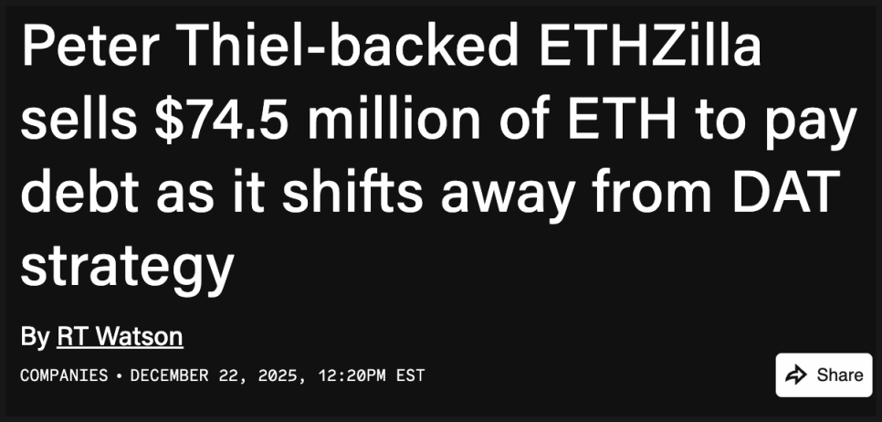비트마인이 이더리움 저점 매집을 시도하는 반면, 이 타이밍에 아예 매도를 선택한 기업도 있었습니다. 바로 피터 틸의 투자를 받은 이더리움 트레저리 기업 이더질라(ETHZilla)인데요. 최근 약 7,450만 달러 규모의 이더리움을 매도해 부채를 상환했다고 밝혀 주목을 받고 있습니다. 그리고 이와 함께, 불과 6개월 전만 해도 핵심 전략으로 내세웠던 이더리움 기반 디지털 자산 트레저리 전략에서 점차 발을 빼겠다는 입장을 공식화했습니다.