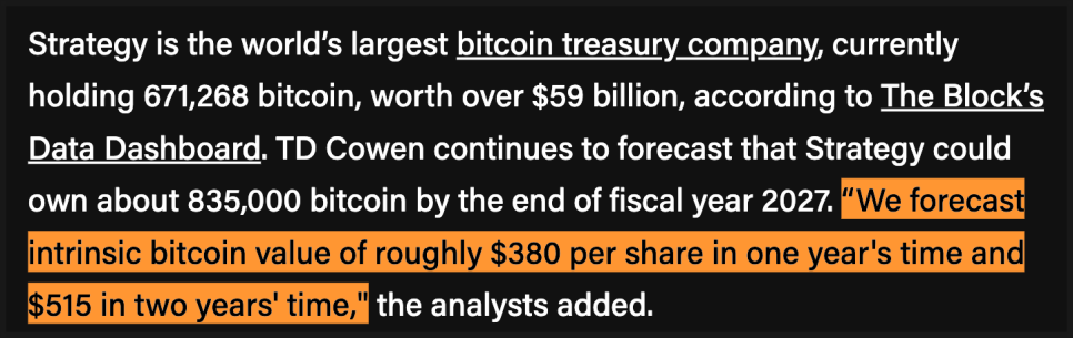 현재 스트래티지는 전 세계에서 가장 큰 비트코인 보유 기업으로, 약 67만1,000개 이상의 비트코인을 보유하고 있습니다. 금액으로 환산하면 590억 달러가 넘는 규모죠. TD 코웬은 2027 회계연도 말까지 스트래티지가 약 83만5,000개의 비트코인을 보유하게 될 것으로 예상하고 있습니다. 이를 기준으로 보면, 1년 뒤 주당 비트코인 내재 가치는 약 380달러, 2년 뒤에는 515달러 수준으로 추정된다고 합니다.
