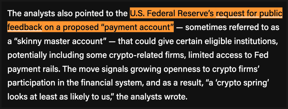 마지막으로 흥미로운 부분도 짚고 넘어가야겠죠. 애널리스트들은 최근 미국 연방준비제도가 ‘지급 계정’, 흔히 말하는 ‘슬림 마스터 계정’에 대해 공개 의견 수렴을 요청한 점에도 주목했습니다. 이 제도가 도입되면 일부 암호화폐 관련 기관들도 제한적이나마 연준의 결제 시스템에 접근할 수 있게 될 가능성이 있습니다. 쉽게 말해, 규제 환경이 점차 암호화폐 쪽으로 열리고 있다는 신호로 해석될 수 있고, 그 결과 ‘크립토 겨울’만큼이나 ‘크립토 봄’이 올 가능성도 충분하다는 게 TD 코웬의 시각입니다.