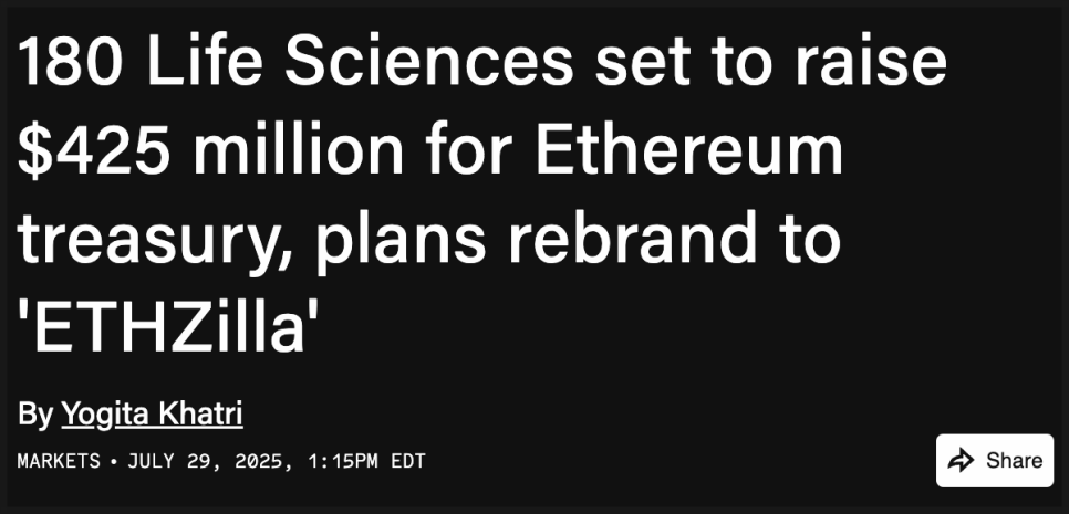 웃긴 건 이더질라가 원래는 180 라이프 사이언스라는 나스닥 상장 바이오기업이었다는 것인데요. 올해 7월, 180 라이프 사이언스는 60곳이 넘는 투자자들과 4억2,500만 달러 규모의 PIPE 투자 계약을 맺고 DAT 전략으로 전환해 이더질러가 됐습니다.