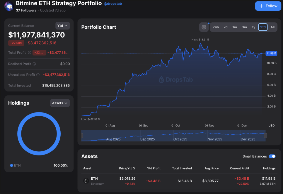 이번 매입 물량은 직전 주의 13만8,000개보다는 다소 줄어든 수준이지만, 회사가 제시한 목표에는 여전히 부합합니다. 비트마인은 장기적으로 전체 이더리움 공급량의 5%를 보유하는 것을 목표로 하고 있죠. 다만 현실적인 부담도 분명히 존재합니다. 최근 몇 달간 가격 하락으로 인해, 현재 기준 비트마인의 이더리움 보유분에는 30억 달러가 넘는 평가손실이 발생한 것으로 추정되고 있습니다.