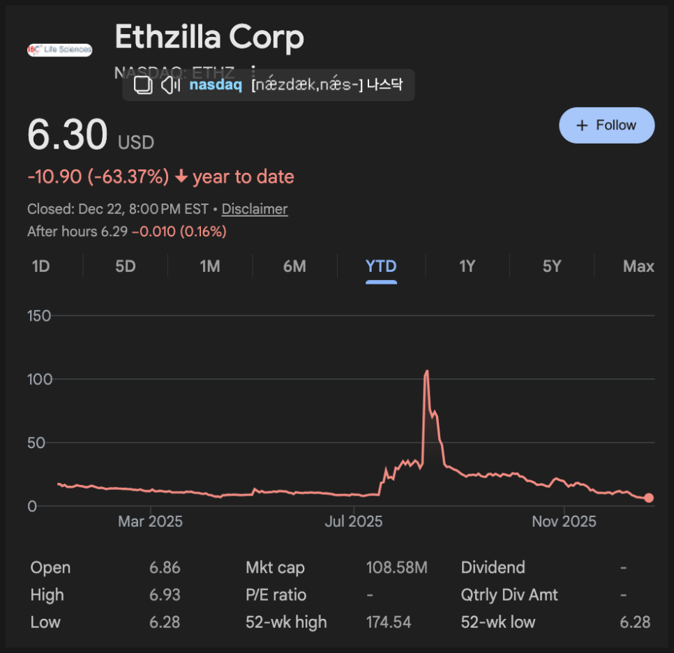 한때 나스닥 상장 바이오기업이었던 이더질라는 피터 틸이라는 상징적인 투자자가 DAT에 참여했다는 소식이 전해졌을 때 주가가 한 달 만에 90% 넘게 급등하기도 했습니다. 하지만 그 뒤로 주가는 90% 넘게 하락하며 최근 6달러 초반대로 내려온 상태입니다. 이더리움 가격이 최근 3개월 동안 약 30% 가까이 하락한 상태에서, 소형 이더리움 트레저리 기업들에는 부담이 커진 상황이죠.