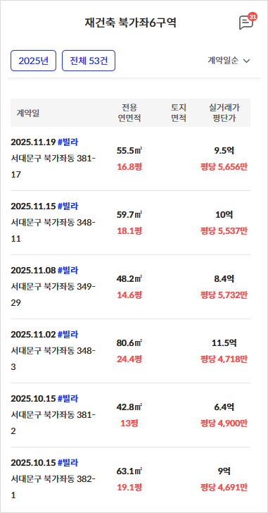 북가좌6구역 재건축의 사업면적은 31,713평이며 용적률이 249.87%로 적용되므로 연면적은 79,243평이다. 재건축 구역이지만 단독주택들을 모아 재건축 한 곳이므로 정확한 평균 용적률을 모르므로 180%로 가정했다. 기존 연면적은 57,083평이고 임대주택 10%(7,924평), 정비기반시설 5,396평, 상가 1천평을 가정하면 일반분양 면적은 7,840평이다.