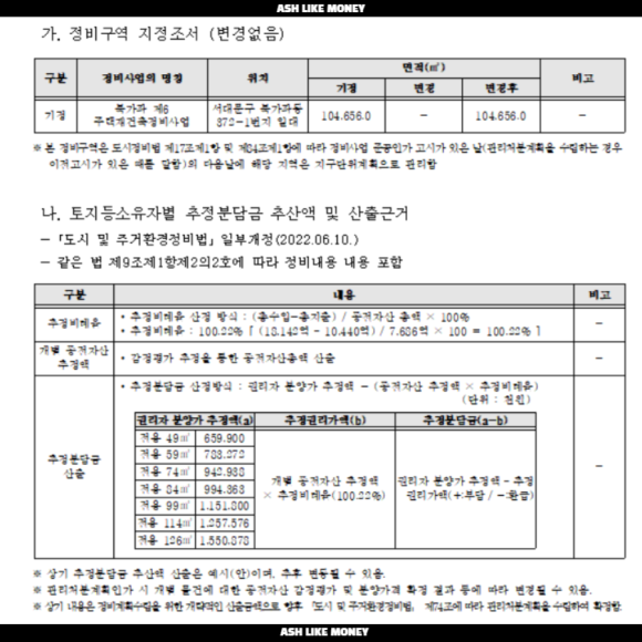 비례율은 {[총 수익 - 총 비용] ÷ 종전자산평가액}이므로 0.9가 나온다. 비례율은 낮은 편이다. 공사비를 높게 잡았다는 것이 원인인데, 아크로라는 하이엔드 브랜드이기에 기존보다 높은 공사비를 잡고 연면적도 지하층을 포함하면 800~900%로 가정했기 때문이다. 만약, 나의 종전자산평가액이 평당 2,500만원에 16평 빌라라면 권리가액은 3억 6천만원이다. 조합원 분양가를 평당 3,600만원으로 잡고 25평이라면 9억이다. 분담금은 5억 4천만원이 나온다.