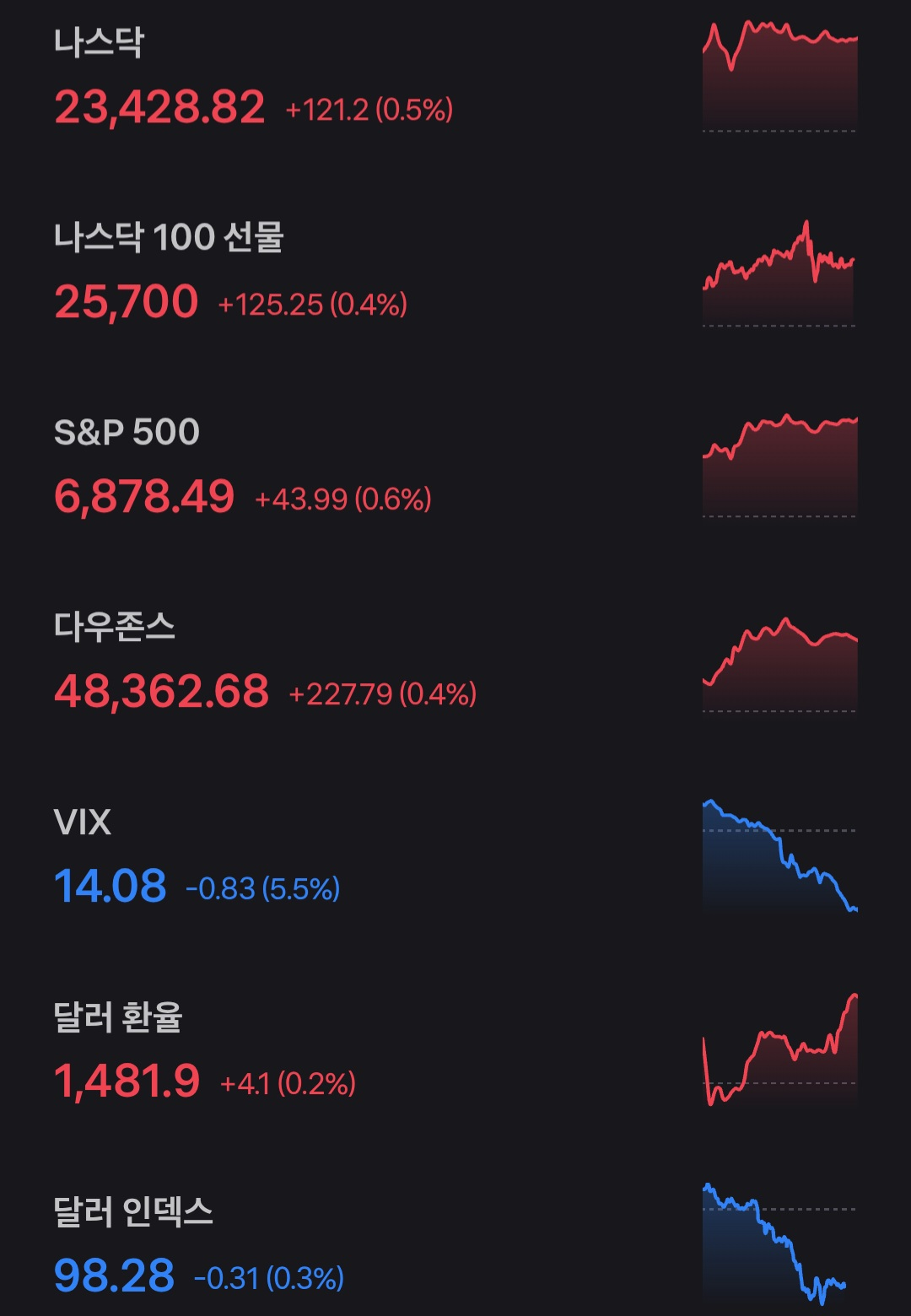 주요 지수는 완만한 상승 흐름을 보였고 변동성 지표는 하락하며 투자 심리는 점진적으로 안정되는 모습입니다. 다만 환율은 여전히 높은 수준을 유지하고 있으며 달러 인덱스 약세와 원화 약세가 혼재된 흐름 속에서 자산별 체감 성과는 차별화되고 있습니다. 시장 전반은 낙관과 경계가 공존하는 국면으로 해석됩니다.