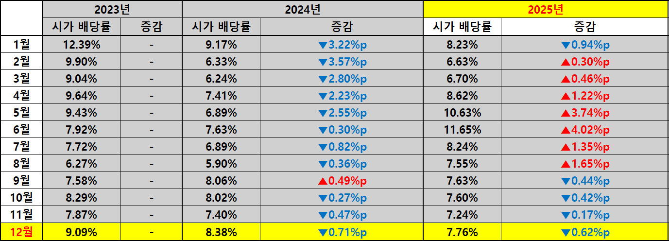 시가 배당률 역시 전년 대비 낮아졌습니다. 지난해 12월 기준 시가 배당률은 8.38%였으며 올해는 7.76%로 약 -0.62%p 감소했습니다. 이는 배당금 감소와 주가 흐름이 함께 반영된 결과로 단기적으로는 배당 매력도가 다소 낮아진 것으로 해석될 수 있습니다.