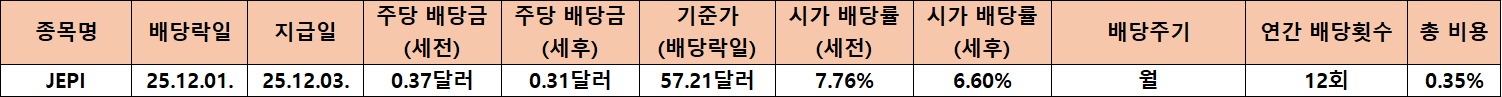 오늘은 월배당 ETF 중에서도 많은 분들이 관심을 갖고 계신 ‘JEPI’의 최근 배당 흐름과 수치를 중심으로 배당 종목 분석을 정리해보았습니다. 단순 배당률 나열이 아니라 실제 데이터가 의미하는 흐름과 구조를 차분하게 짚어보려 합니다.